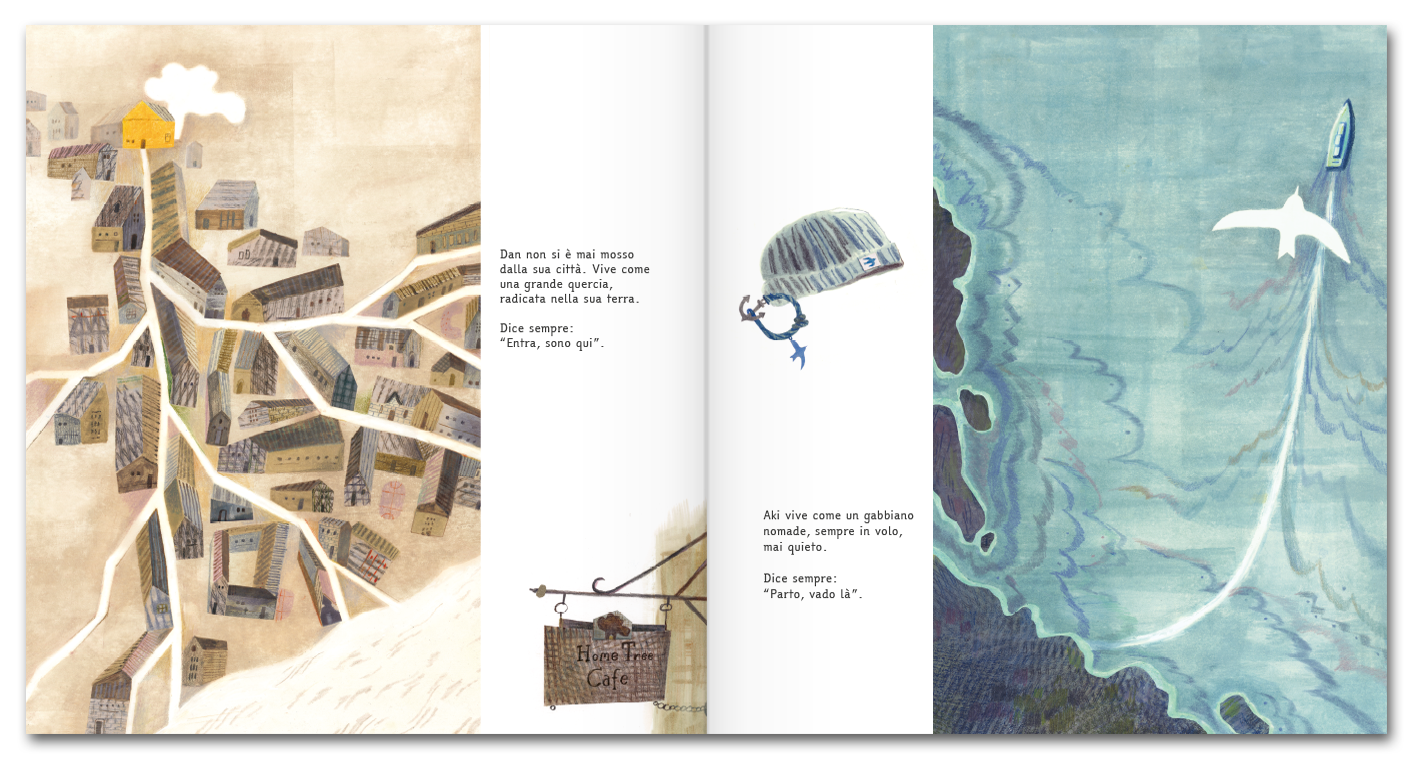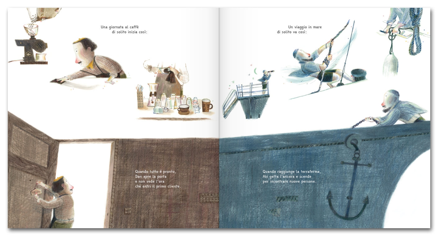 Un albo poetico e quasi filosofico, di contrasti e simmetrie, sulla vita di due uomini: un marinaio avventuriero e l’uomo del caffè, del porto, dove ogni tanto il marinaio approda con la sua nave. Due uomini con una vita tanto diversa, ma con un desiderio che li accomuna e li avvicina…