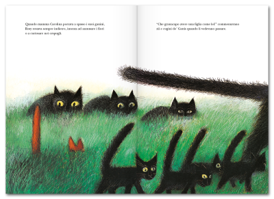 «Un albo che tocca con leggerezza il tema della “diversità”: qui si tratta dell’iniziale emarginazione di una micetta scandalosamente rossa in una famiglia di gatti neri… Delicatezza, simpatia, lieto fine».