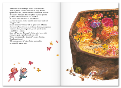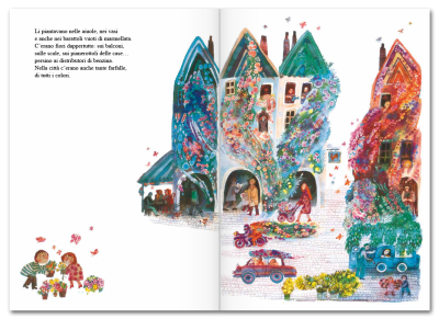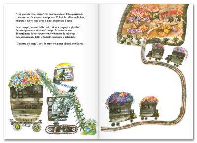La città divenne allora grigia e triste. Ma un giorno, due bambini scoprirono il giardino segreto dove tutte le piante erano state nascoste. I due aprirono il grande cancello e liberarono i fiori e le farfalle. Poi ci pensò un temporale a spargere i semi dei fiori su tutta la città. Presto cominciarono a spuntare i primi germogli. E, con i fiori e le farfalle, tornarono nella città anche i colori e l’allegria.