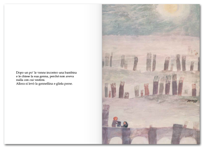 Per strada incontrò un uomo affamato che le disse: “Dammi qualcosa da mangiare”. E la buona bambina gli donò il suo unico tozzo di pane. Poi incontrò un bambino infreddolito che le chiese il suo berretto...