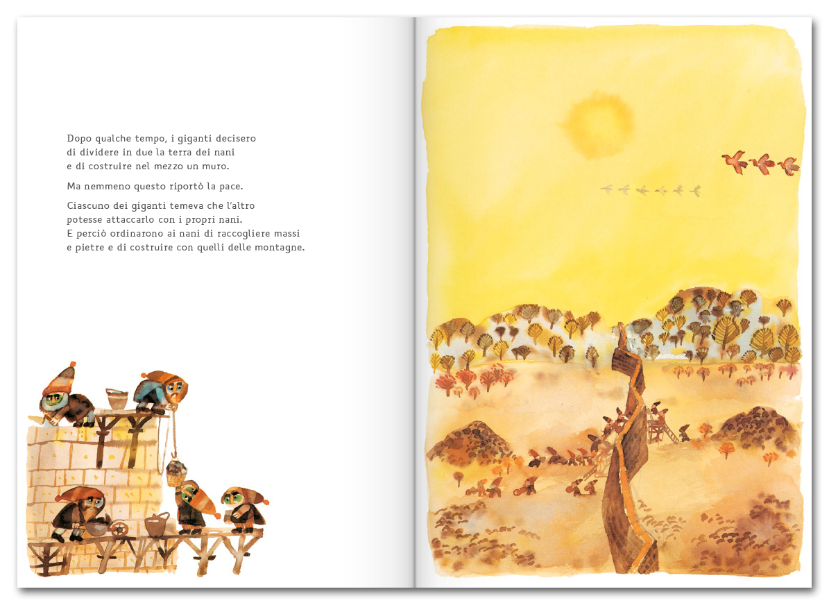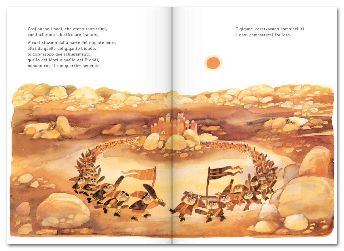 Un giorno, in questo luogo tranquillo e felice, arrivano due giganti, il Biondo e il Moro: con i loro enormi piedoni distruggono i prati e i campi dove passano e il rimbombo delle loro voci cavernose incute un gran terrore nei poveri nani, che ora non ridono più.
