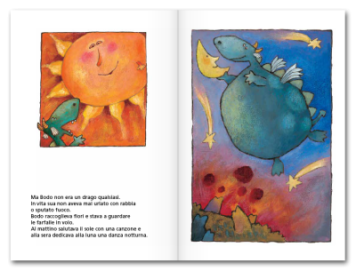 Bodo deve forzare la sua natura di drago gentile più portato a cantare e danzare che ad emettere urla e fuoco da spavento. Lo farà con impegno per aiutare il suo piccolo amico che, rassicurato, riuscirà ad addormentarsi. A Bodo, però, resta un’ultima domanda: “Chissà, dovrei forse chiedere scusa alla paura?”.
