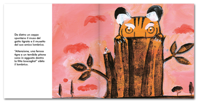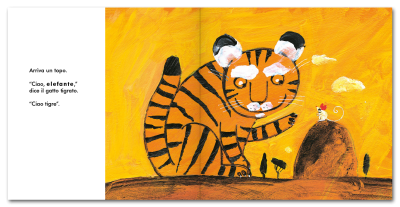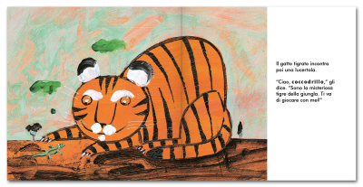Un gatto tigrato incontra una lucertola. “Ciao coccodrillo,” gli dice. “Sono la misteriosa tigre della giungla. Ti va di giocare con me?”.