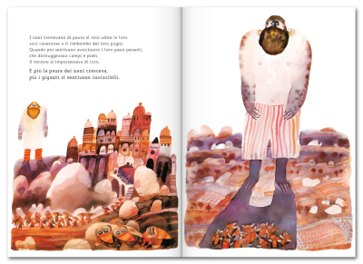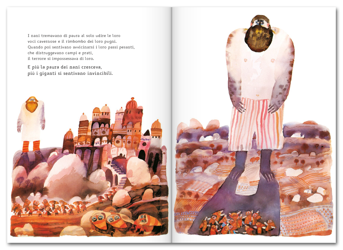 Un giorno, in questo luogo tranquillo e felice, arrivano due giganti, il Biondo e il Moro: con i loro enormi piedoni distruggono i prati e i campi dove passano e il rimbombo delle loro voci cavernose incute un gran terrore nei poveri nani, che ora non ridono più.