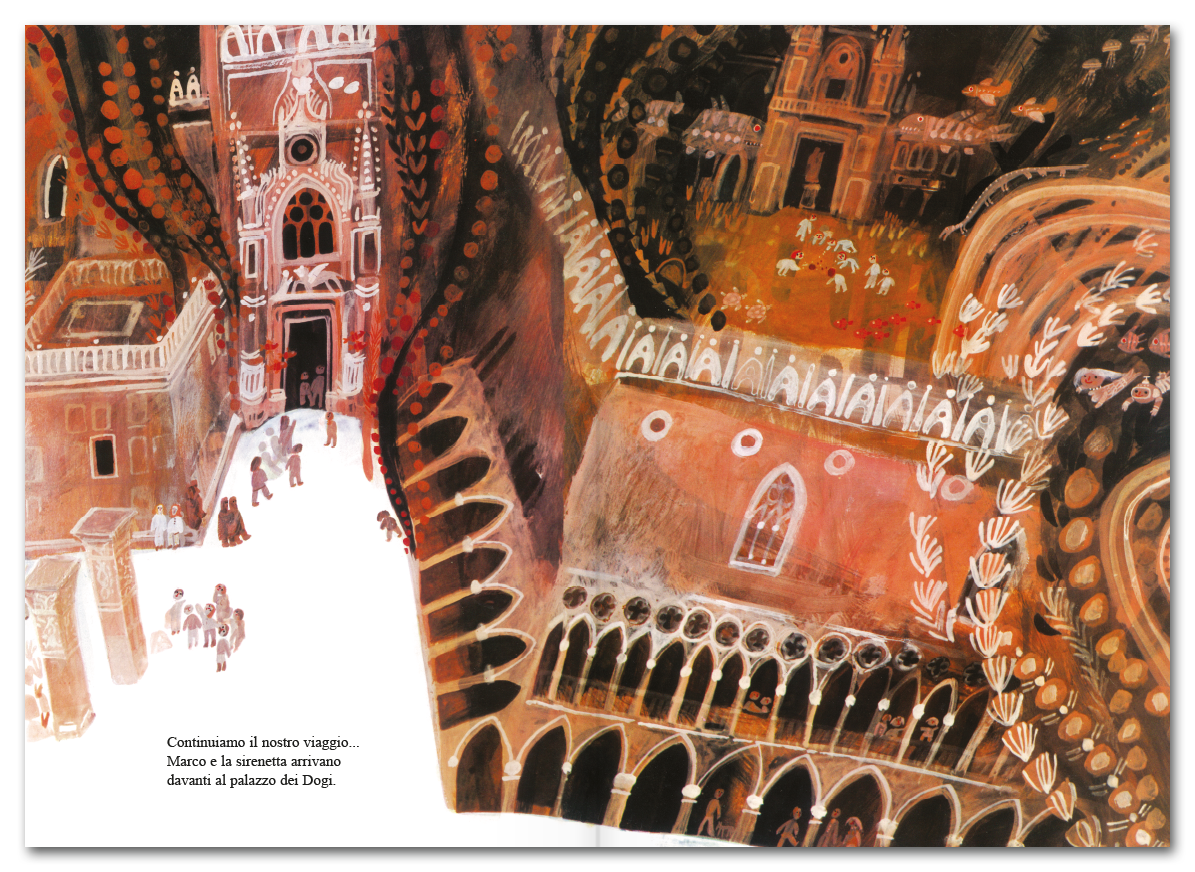 “Un giorno Venezia potrebbe essere sommersa dal mare”, così spiega la maestra a scuola. La notte, Marco sogna di visitare l’incantata città in fondo al mare guidato da una sirena.